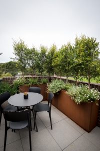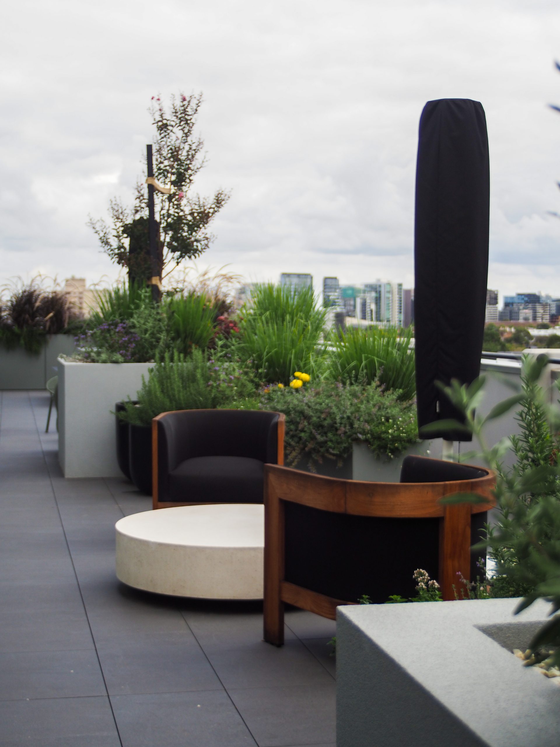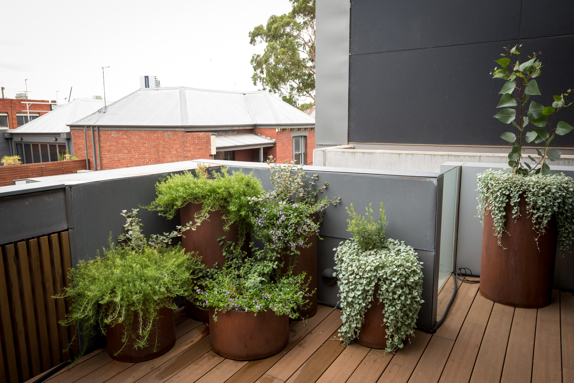 We used custom steel planter boxes and pots against the balcony walls to create different zones on the terrace. The distinct areas were for entertaining and relaxing for our clients, their 3 young adult children and the family cat. Taking into account the hot coastal winds and the fact that the site was very exposed (roof top terrace) , we used large, planter boxes to reduce the amount and speed of evaporation. A gardening rule of thumb is the more soil mass the slower it will dry out. We also installed a fully automatic irrigation system from Sunshower to the deck planters, pots from Kellock Pots and Planters and the vegetable garden.