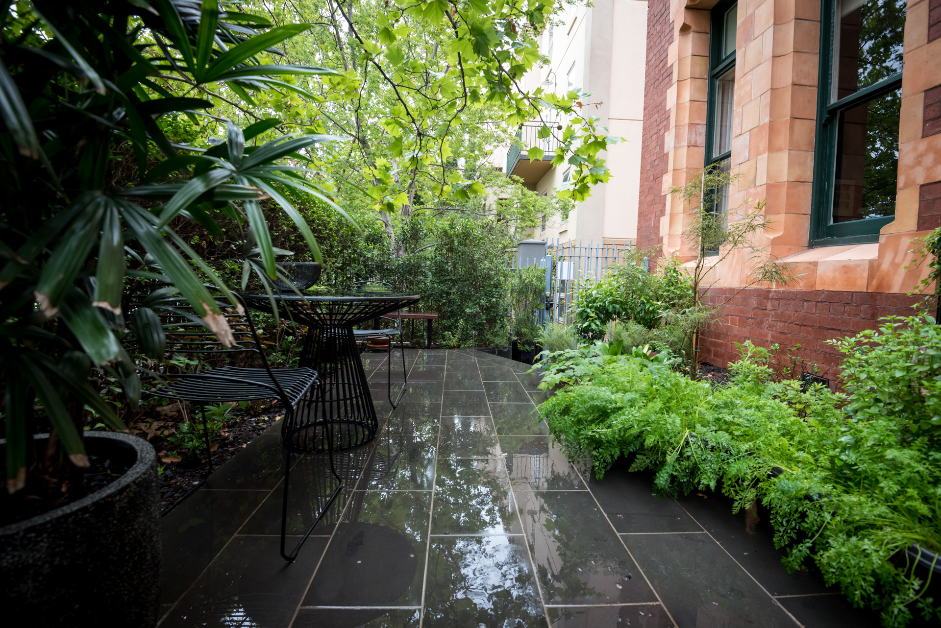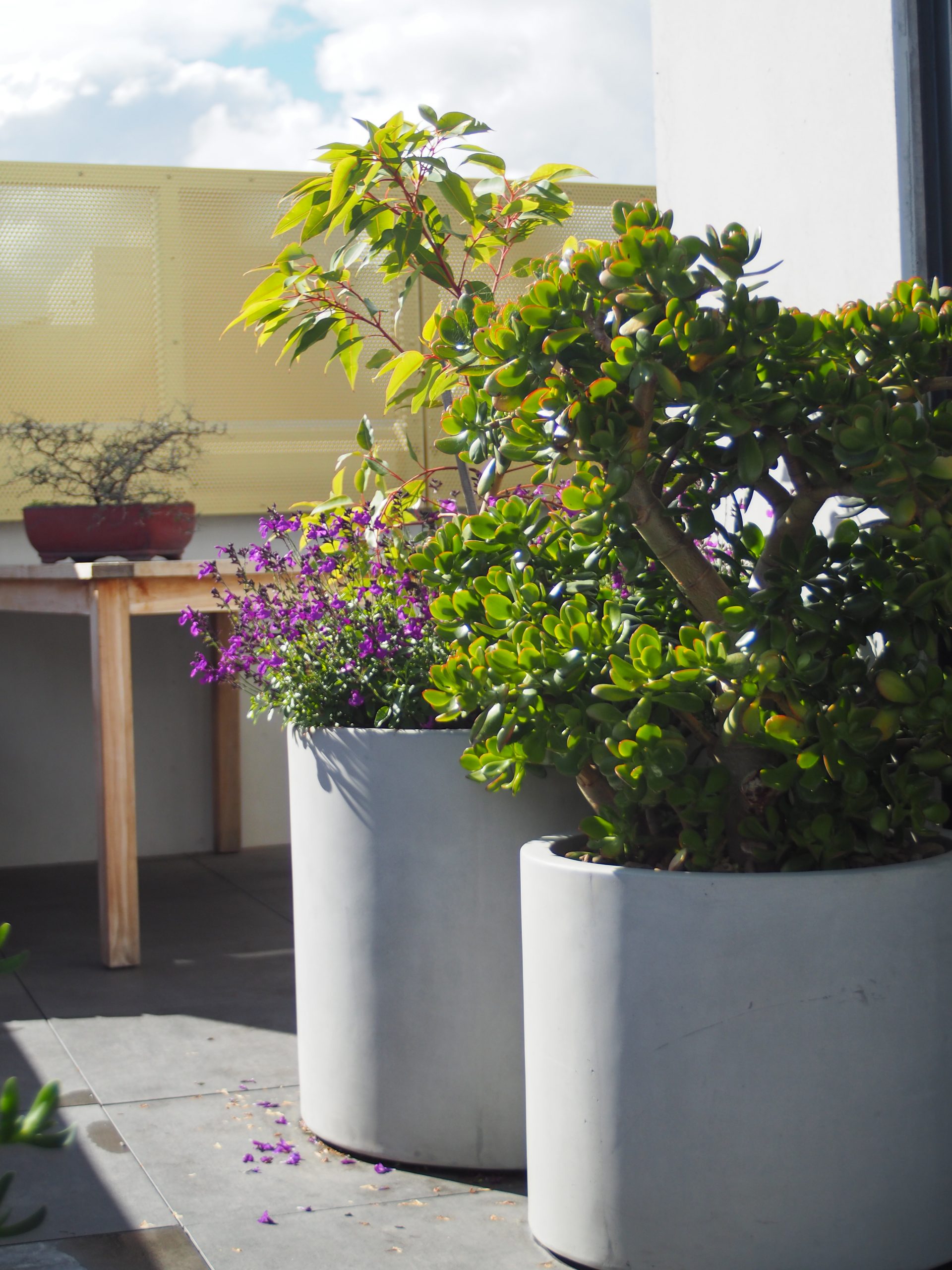 The planters were filled with a wide range of plants and trees. Azalea, Sedum, Lavender, Coastal Correa and Seaside daisy. Herbs included Oregano, Thyme and Rosemary. Succulents including, Jade plant, Jelly bean and Aeonium ‘Schwarzkopf’ add diversity to the design. Lemon and Lime Citrus dwarf cultivars, Lilly Pilly, Crepe Myrtle and Portuguese Laurel trees add height and drama.