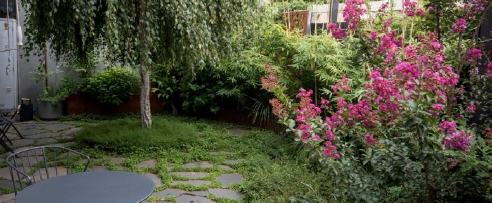 a narrow bluestone terrace in a new build, a modern townhouse and a native garden with a lovely new paved terrace overlooking the garden, all dotted around Melbourne.