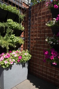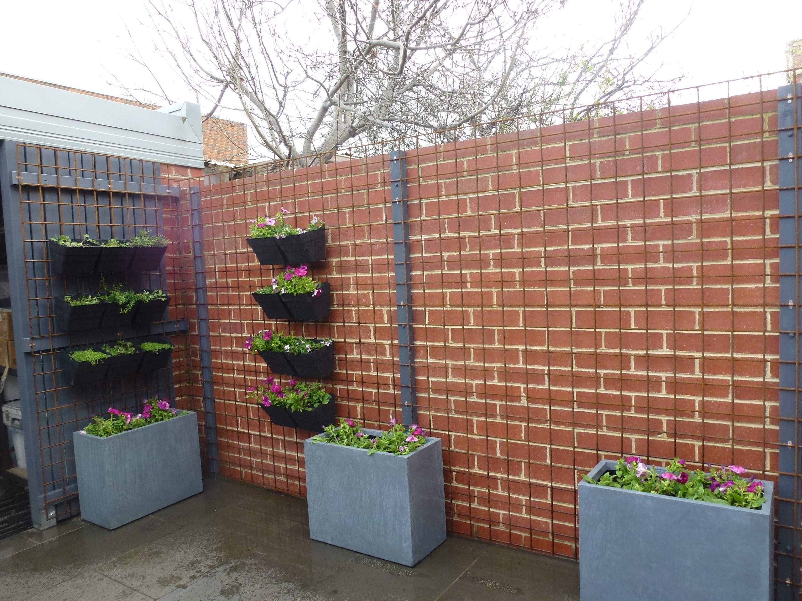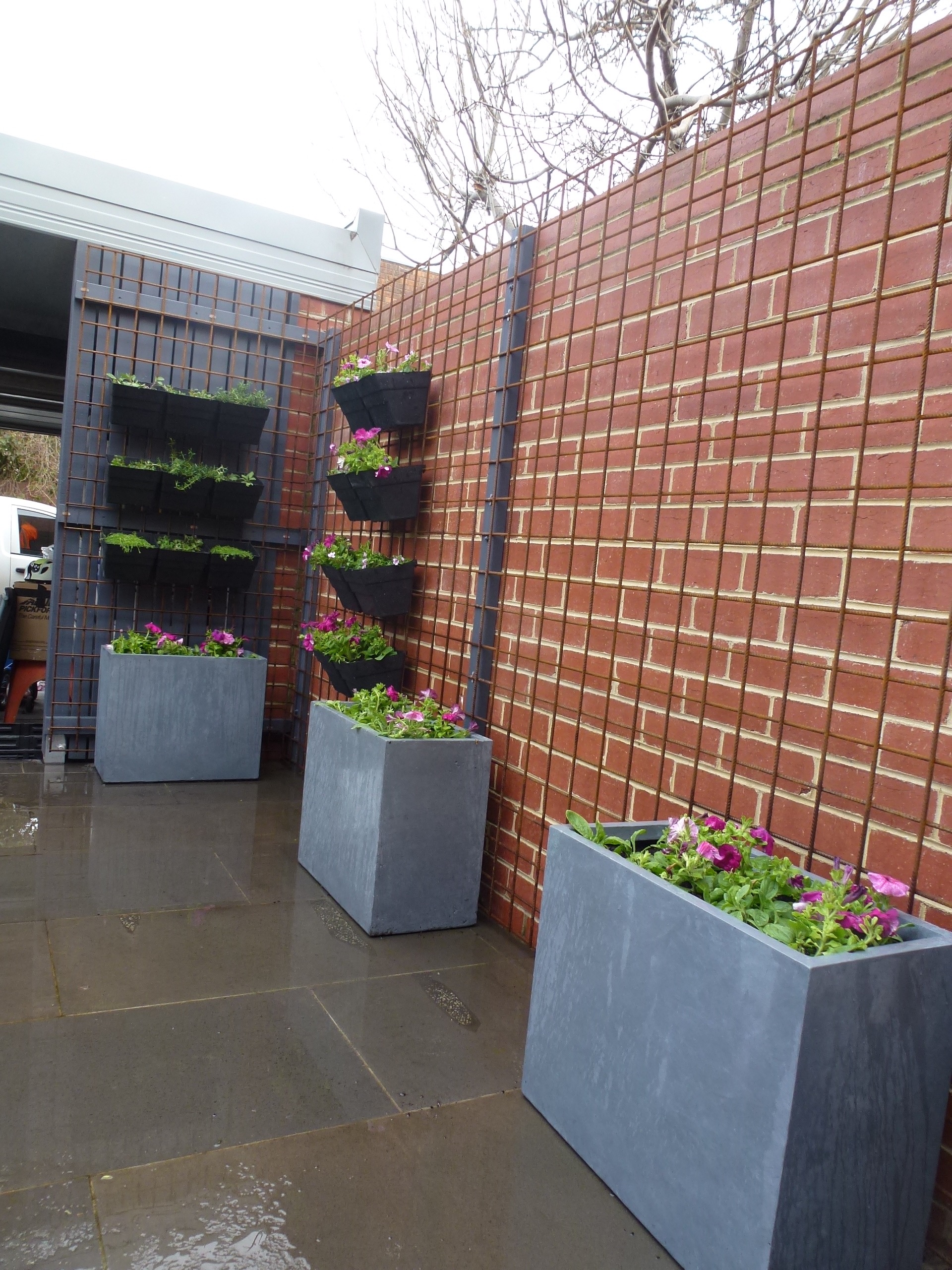 We’ve included a screen to the car parking area, tensioned wire to support tomatoes, beans and passionfruit, and a vertical garden with herbs and some