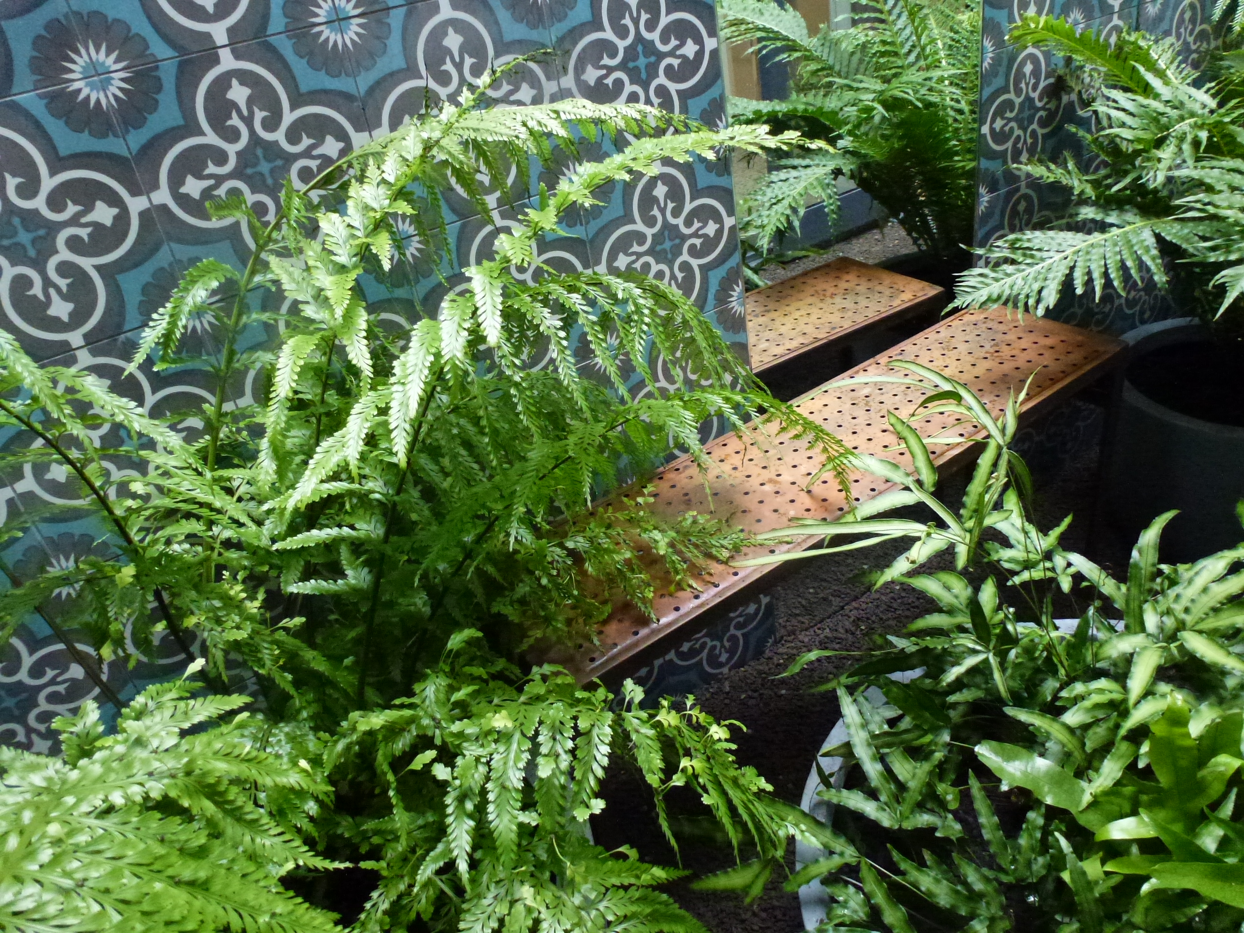 Our client wanted a lush garden. We tiled the boundary wall in ‘Marrakesh’ with mirrors to reflect the plant foliage. Then it was matter of cold tolerant ferns to fill the space. The low table was custom made by madebylui.com and will hold candles to add some twilight to the space.