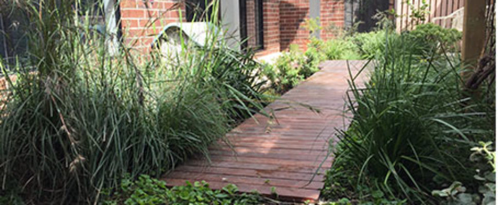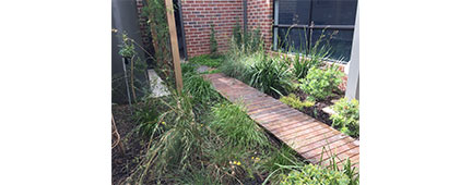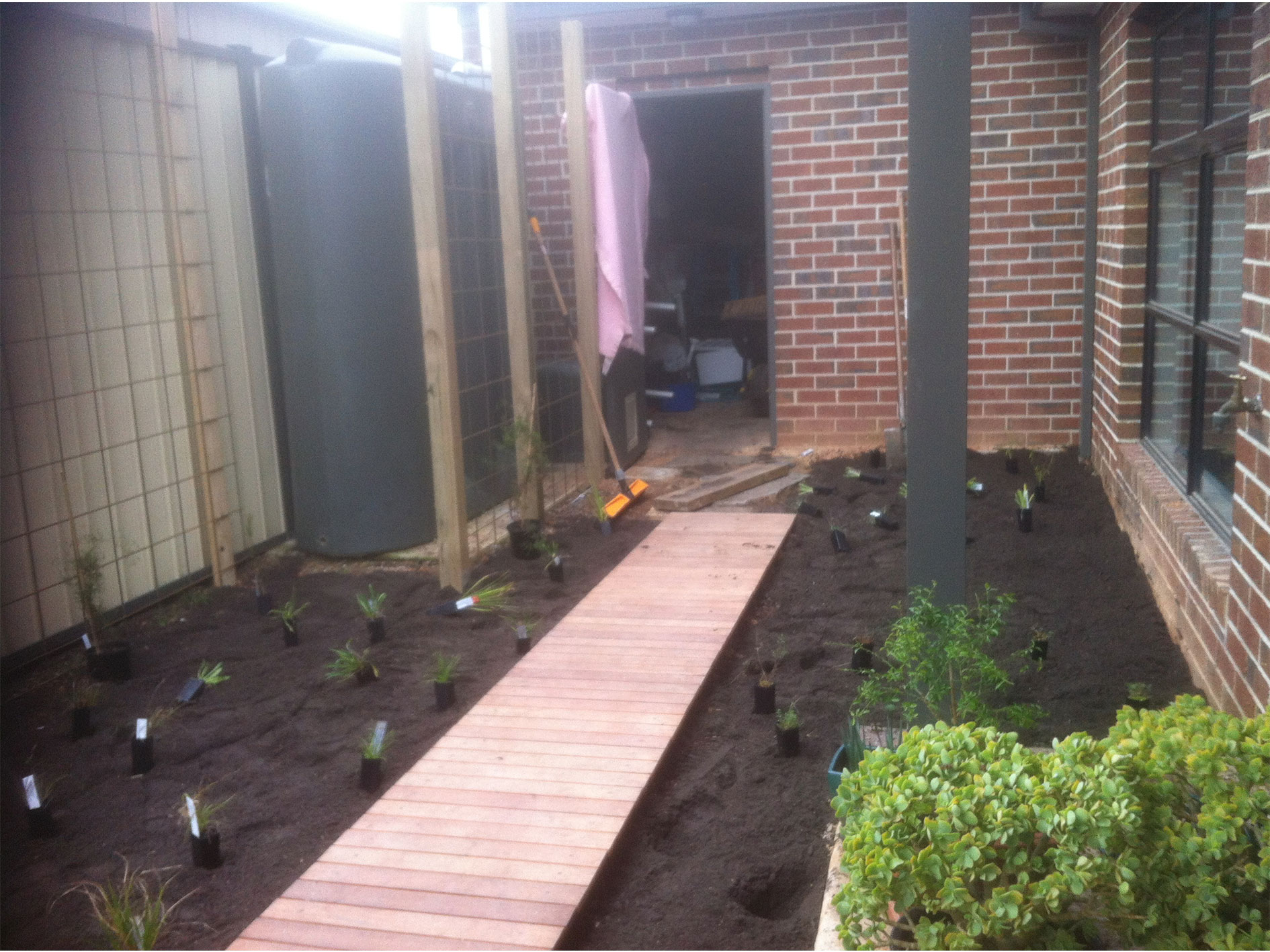 This courtyard has been transformed from boring old gravel and step stones to a wonderful native garden, full of wild flowers. We first came upon this courtyard a couple of years ago. It was a classic new townhouse with lots of gravel and step stones, minimal landscaping. The developers actually did our client a favour because we didnt need to do much to transform it to what she wanted. We’ve replaced the step stones with a board walk which gets her from a to b, the old clothesline concrete right outside the living room is a great place to sit in the garden (we moved the clothesline out of sight!), and the rest, well it’s all native shrubs and ground covers that will cope on this site. The upshot, we think it’s a pretty nice garden to enjoy, from inside looking out, from a to b on the way to work, and, just to sit in and enjoy the sunshine. It’s a little bit of native sunshine, in Sunshine.