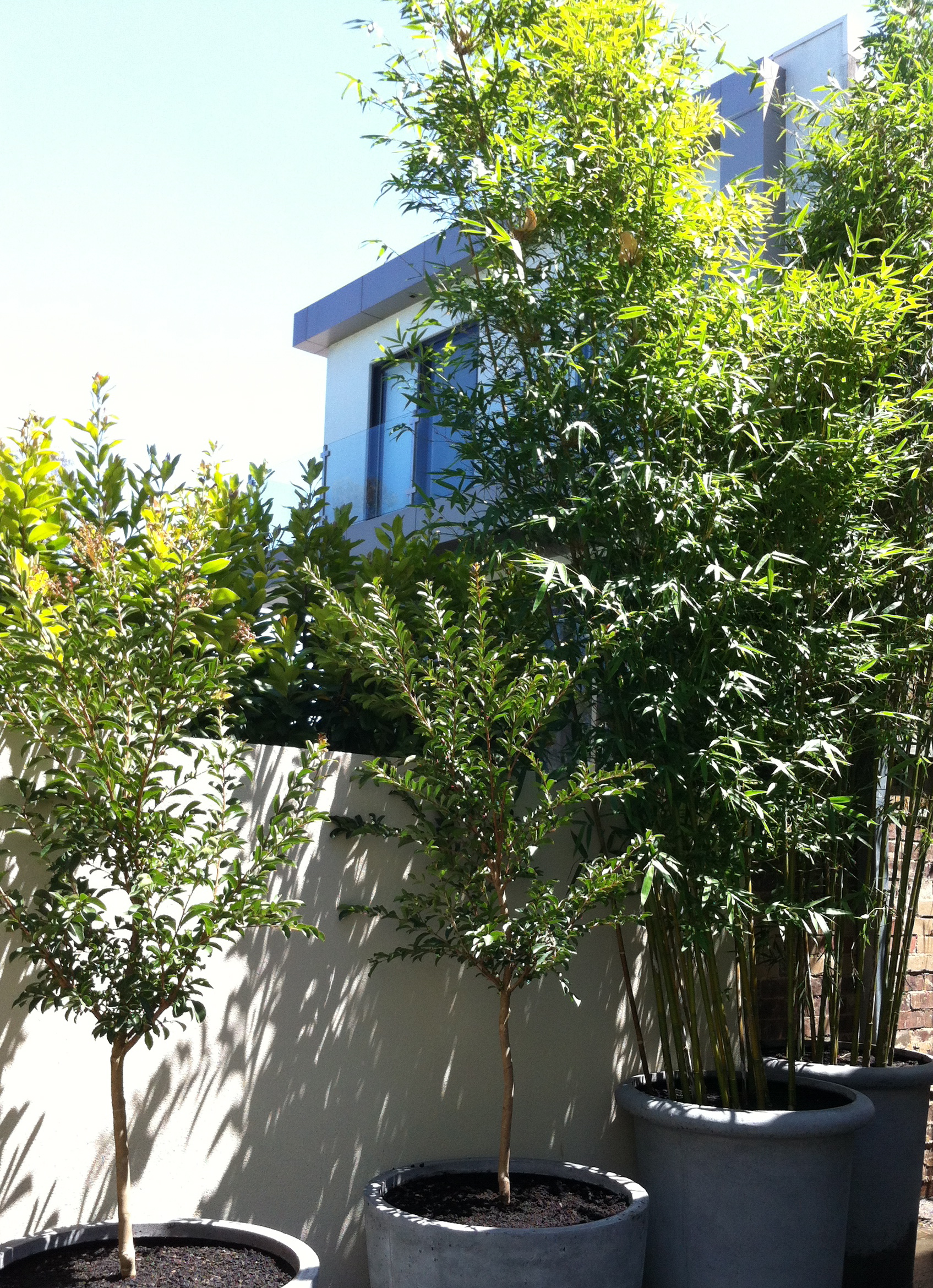 The same planters are carried through to the pool garden and the main courtyards. We have created a tropical feel, lots of clumping bamboo which has been used to screen the side boundaries and create an enclosed space. Completed with a mix of Bangalow Palms and other evergreen lush foliage. A pleasant place to sit and take in the sun.
