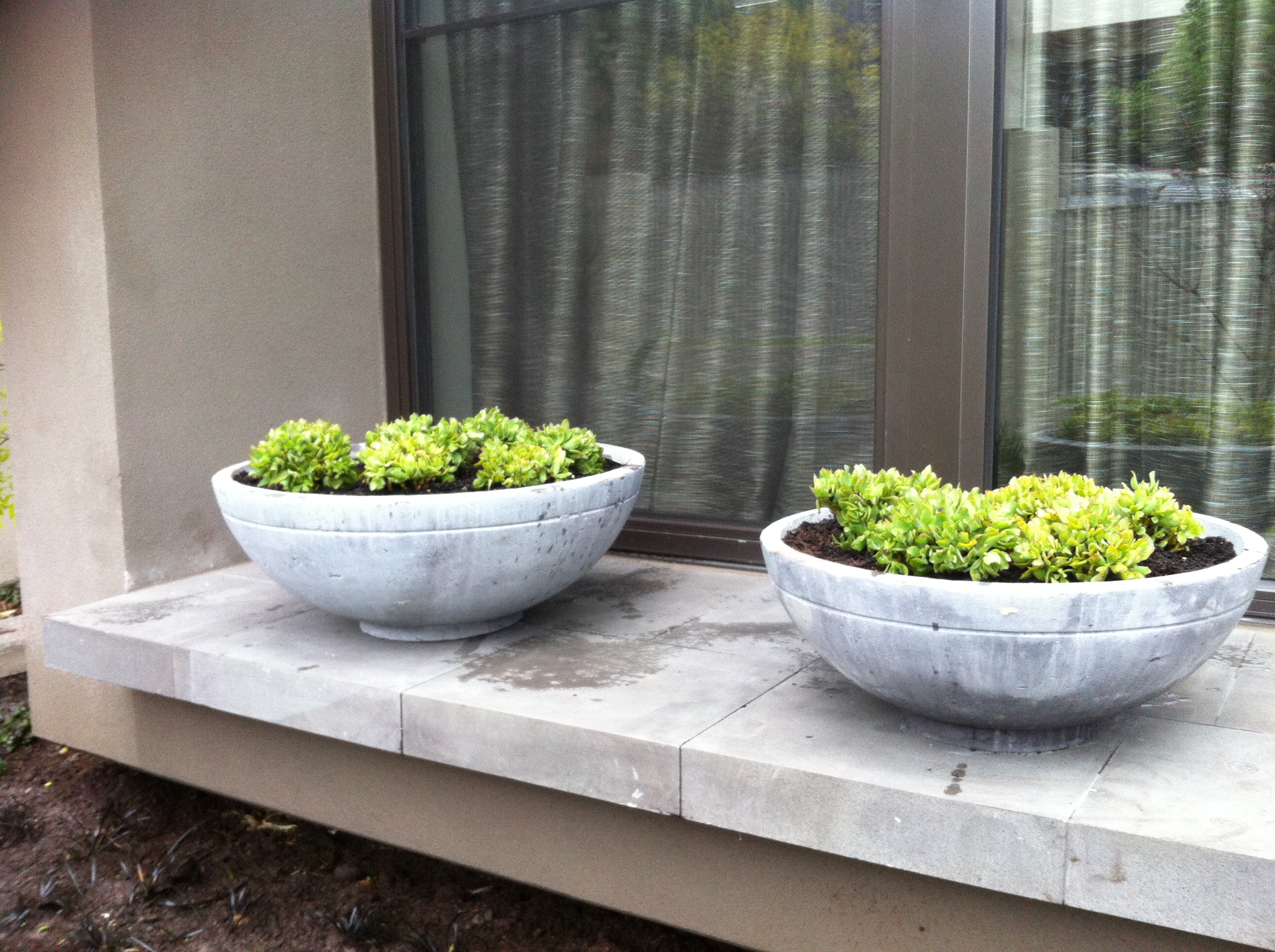 The front gardens feature simple round bowls that reflect the bluestone paving. Planted out with succulents to create a modern clean look, softened by lawn and Crepe Myrtle.